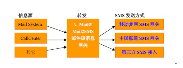 U-Mail電信級郵件系統(tǒng)與短消息系統(tǒng)連接,構成一套完整的自動通知系統(tǒng)。