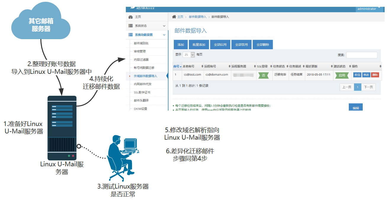 以上的切換方案,在遷移切換期間,服務均不影響,只有在后一步,舊服務器下線,新服務器上線的這階段會有些影響,在此期間可能會存在一小部分新的郵件數據在舊的服務器上面,視情況而定,可以在切換服務器后再根據實際情況差異化遷移一下郵件即可。而U-Mail郵件系統是支持差異化遷移的。