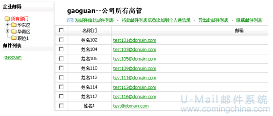 新建為“gaoguan”的聯(lián)系人表,顯示在webmail企業(yè)郵箱界面左邊,一點(diǎn)擊,則右邊呈現(xiàn)出高管們的姓名、地址和相應(yīng)操作,一目了然,簡單方便。
