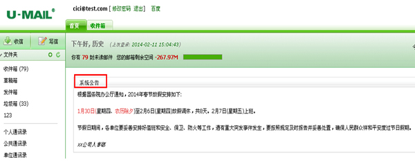 三、我們通過設(shè)置“系統(tǒng)公告”,能將信息傳達(dá)到每個(gè)企業(yè)郵箱用戶,操作路徑為:登錄郵件服務(wù)器域管理后臺——webmail設(shè)置——系統(tǒng)公告設(shè)置。這樣一旦用戶登錄webmail首頁后即可看到如下圖所示界面:
