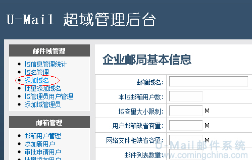 酒店有人事部、行政部、財務部、客服部等單位,對應在郵件系統中,相當于每個域,如下圖,域名、用戶數和大小均可自由設定。