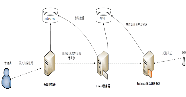 U-Mail郵箱賬號與密碼同步到radius數據庫:郵箱獲取到賬號信息并設置默認密碼后,同步到本機radius庫中(用于radius無線認證服務),用戶修改密碼后也需要同步。