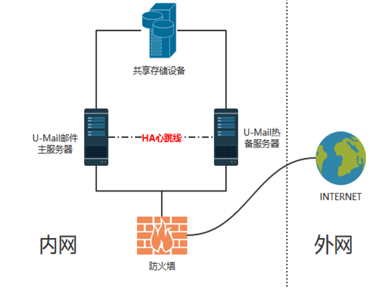 部署方案:U-Mail郵件系統工程師根據該軟件公司的需求,推薦采用雙機熱備的部署方案:主備服務器通過IP做心跳檢測,周期性的發出相互檢測的測試包。如果此時主服務器出現故障后,備服務器在連續丟失設定數目的檢測包,會認為主機出現故障,這時候備服務器會自動檢測設置中是否有第二種心跳,如果沒有第二種心跳的話,備服務器則根據已設定的規則,啟動相關服務、掛載相關存儲、設置相關VIP(對外提供的虛擬IP地址),自動完成雙機熱備的切換。