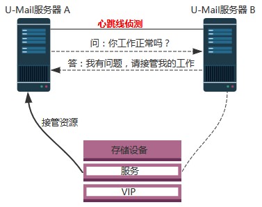 企業(yè)需要U-Mail的雙機(jī)熱備解決方案,它通過數(shù)據(jù)線連接兩臺(tái)服務(wù)器,自動(dòng)偵測(cè),一旦某臺(tái)服務(wù)器發(fā)生故障,就能迅速切換到另一臺(tái)服務(wù)器,繼續(xù)提供服務(wù)。整個(gè)過程:
