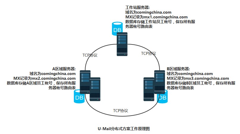 內(nèi)部收發(fā)使用各自區(qū)域的服務(wù)器收發(fā)郵件,如果收件人不在當(dāng)前服務(wù)器,會(huì)自動(dòng)通過相關(guān)TCP協(xié)議檢查另外兩臺(tái)服務(wù)器,如果另外兩臺(tái)服務(wù)器有該收件人,則將郵件傳輸過去。如果沒有,則退信給發(fā)件人。
