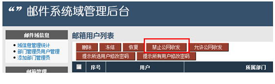 作為內網交流使用的政務郵件系統,可以登陸管理員后臺,對賬號批量設置公網群發權限;或者新申請賬號的時候就做好數據安全措施,防范于未然: