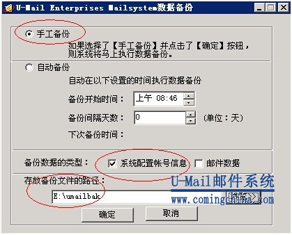 U-Mail郵件系統自帶了備份功能,可以對“系統配置帳號信息”和郵件數據等手動或定時備份,對于服務器異?;蚍掌鲾祿w移可以實現一鍵式恢復,非常方便,如下圖: