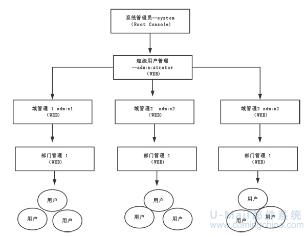 U-Mail郵件系統軟件采用多級管理模式,將用戶分為管理員和普通用戶,共分四級管理:系統管理員、超域管理員、域管理員、部門用戶管理員。U-Mail郵件服務器支持多域名,通過相應的管理、統計工具,能有效對多域進行管理,不同的分支機構分配不一樣的域名。