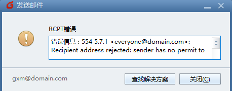 客戶端工具發(fā)送郵件提示“Recipient address rejected: sender has no permit to send maillist!”,如下圖: