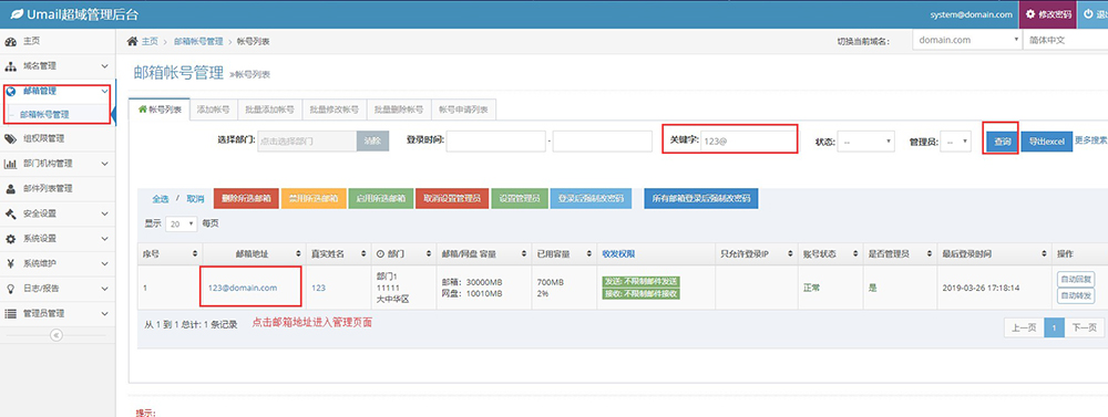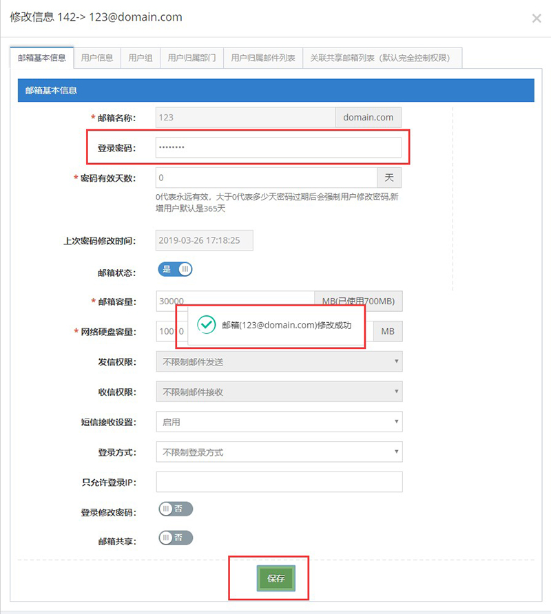 A:在超域管理后臺中點擊郵箱管理-郵箱帳號管理,然后搜索指定人員,點擊藍色郵箱地址,進入管理頁面進行密碼修改,修改成功會有提示,請注意密碼須滿足密碼規則要求(域名管理-域名配置-域名功能設置-密碼規則)。
