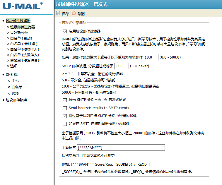 點 擊上面的“啟發式”選項,此項一般不用修改。默認選擇對勾“啟用啟發式郵件評分系統”和“在SMTP連接抄本中顯示啟發式結果”。如果關閉對勾“啟用啟發 式郵件評分系統”,則表示不啟用垃圾郵件過濾器。郵件是垃圾郵件,如果分數超過或等于10.0,SMTP 郵件被拒,分數超過或等于12.0,這里數值越大過濾越寬松,不建議修改默認參數。