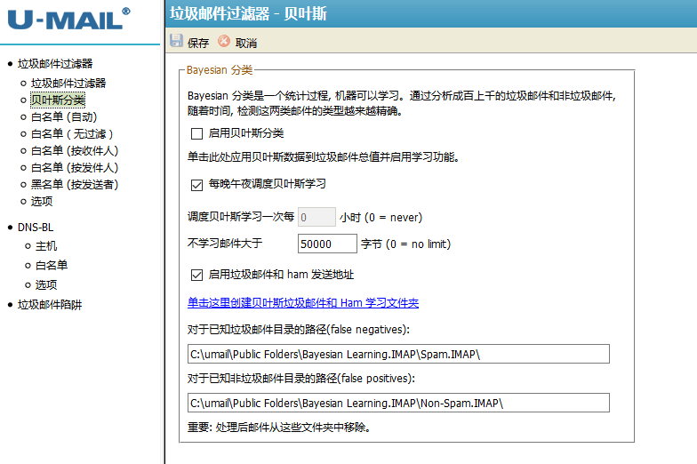 點擊上面的“Bayesian”選項,此項一般不用調整。默認選擇對勾“把Bayesian 知識應用到啟發式郵件分數中”、“啟用Bayesian 預定學習”和“啟用垃圾郵件地址和ham 發送地址”等。在“對于已知垃圾郵件目錄的路徑”下輸入框內容為D:umailPublic FoldersBayesian Learning.IMAPSpam.IMAP,在“對于已知非垃圾郵件目錄的路徑”下輸入框內容為D:umailPublic FoldersBayesian Learning.IMAPNon-Spam.IMAP。