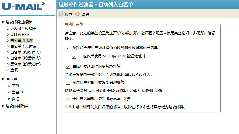 點擊上面的“白名單(自動)”項,一般不用進行設置。默認選擇前3 個對勾,第1 個對勾為“啟用地址簿白名單”,第2 個對勾為“啟用自動地址簿更新”,第3 個對勾為“使用白名單郵件更新Bayesian 引擎”。