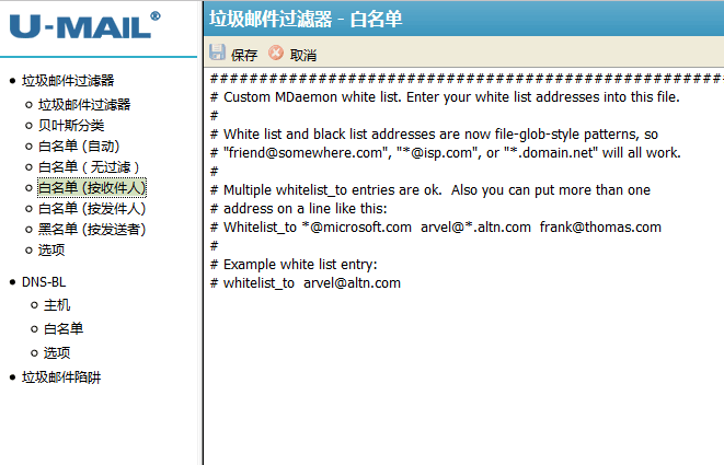 點擊上面的“白名單(收件人)”選項,可以添加排除本地某個信箱,不進行垃圾郵件過濾。如排除aaa@domain.com 信箱收到的郵件不進行過濾,則在下面添加“whitelist_to aaa@domain.com”即可。如排除服務器某個域名不進行過濾,如aaa.com 域名不進行垃圾郵件過濾,則在下面添加*@aaa.com 即可。