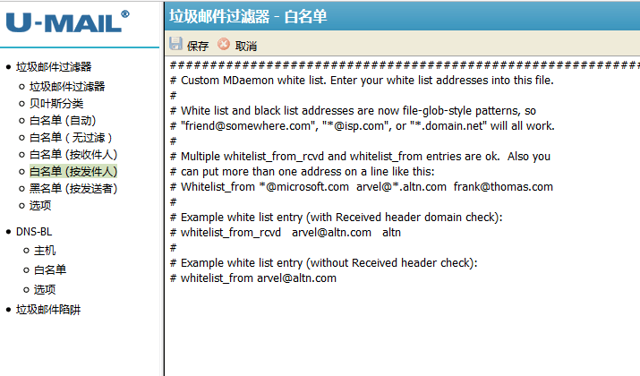 點擊上面的“白名單(發件人)”選項,可以排除外面發進來的地址不進行垃圾郵件過濾。如排除過濾comingchina.com 域名發過來的郵件,則在下面輸入“whitelist_from *comingchina.com”即可。如排除過濾abc@comingchina.com 信箱發過來的郵件,則在下面輸入“whitelist from abc@comingchina.com”即可。