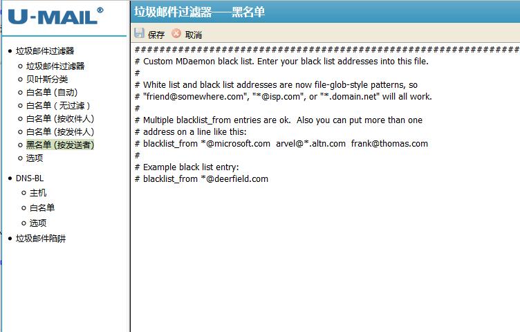 點擊菜單左邊的“垃圾郵件過濾器”,可以設置一些垃圾郵件過濾的參數,一般不建議進行調整。包含選項有“垃圾郵件過濾器”、“啟發式”、 “Bayesian”、“報告”、 “排除”、“白名單(自動)”、“白名單(收件人)”、“白名單(發件人)”、“黑名單”等。比較常用的是在“白名單(收件人)”和“白名單(發件人)” 項排除地址。