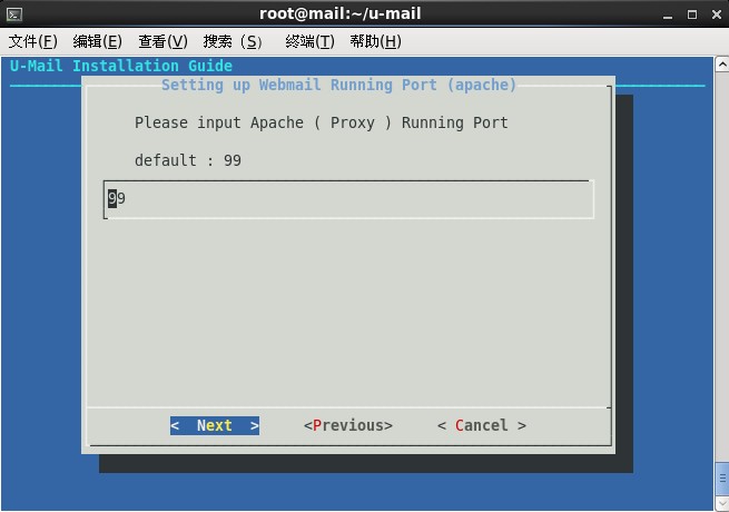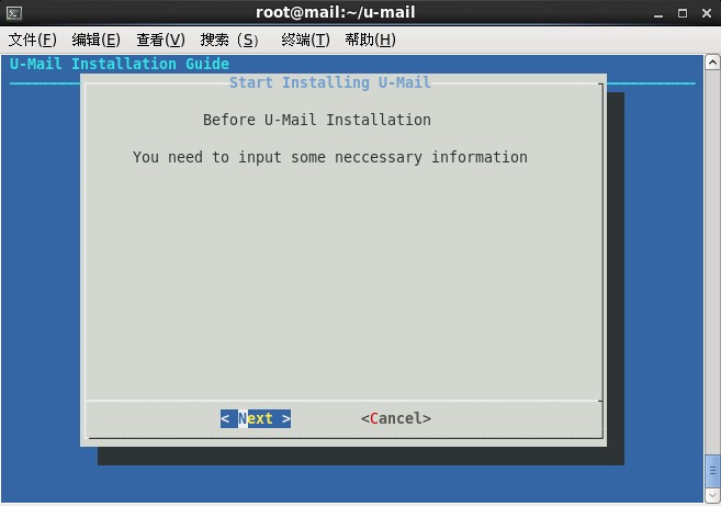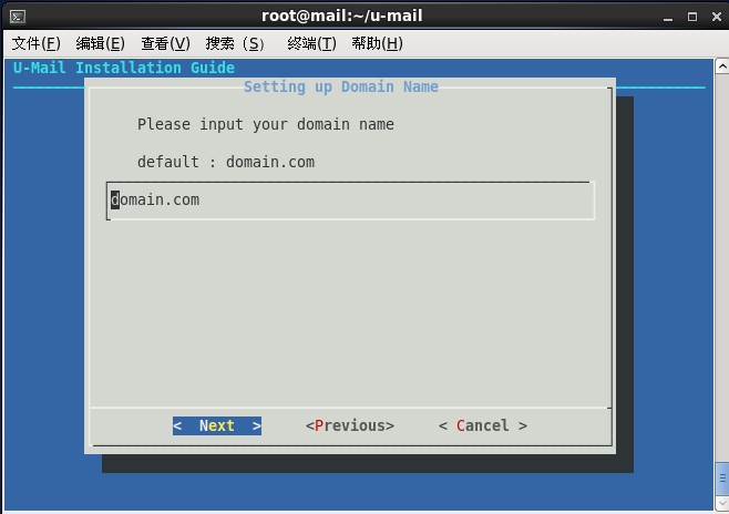 4、出現U-Mail安裝向導,輸入郵箱域名后,選擇“Next”確認,如下圖: