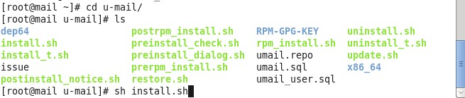 3、解壓后產生u-mail目錄,使用cd u-mail命令切換目錄,并運行sh install.sh執行安裝腳本,如下圖: