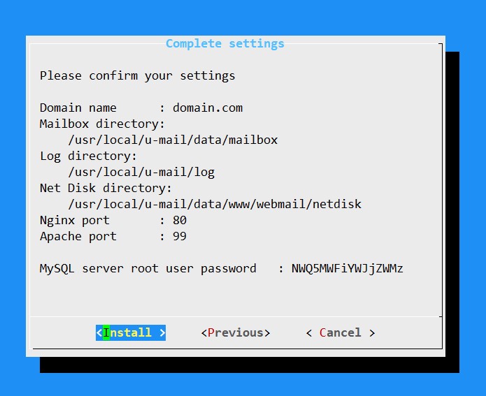 12、中間安裝過(guò)程忽略,直到提示【請(qǐng)輸入 'system@domain.com' 的密碼:】,在這里自行設(shè)置下管理員的密碼,輸完回車確定,若后面忘記,可以在安裝完成后執(zhí)行:/usr/local/u-mail/app/sbin/admin_setting init來(lái)重置管理員密碼。