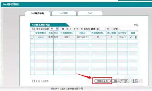 2、添加端口映射,點擊NAT靜態映射列表下方的“添加新條目”功能