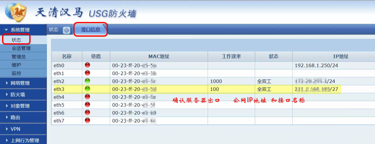 登錄天清漢馬USG防火墻,找到系統(tǒng)管理—狀態(tài)。如圖確認(rèn)服務(wù)器出口和公網(wǎng)IP