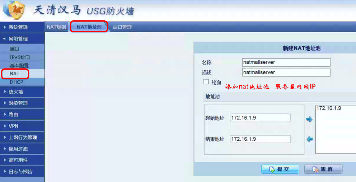 接著到網(wǎng)絡(luò)管理選項—找到nat項目,nat地址池,添加服務(wù)器nat地址池