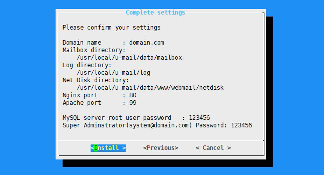 25、設置超域管理員后臺的密碼(超域管理員后臺的賬號是system@domain.com 后面的域名修改為您們自已的域名),不要使用弱密碼,以免出現安全問題,【Next】下一步:
