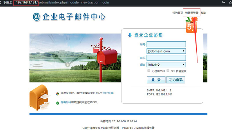 30、服務器重啟好,使用IP地址或者域名訪問一下服務器,這邊測試的訪問地址是【http://192.168.1.181】切記,需要修改為自已的服務器地址,在右上角可以點擊【管理員登錄】, 如果端口有修改為非80端口,則訪問的時候帶上端口號,如:http://IP:8080