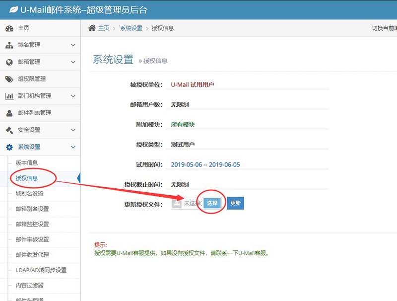 33、更新授權文件,點擊【系統設置】,【授權信息】,更新授權文件進行導入授權