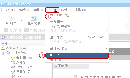 (1)、首先設(shè)置郵件帳號(hào):打開Outlook Express后,單擊菜單欄中的“工具”,然后選擇“帳號(hào)”;