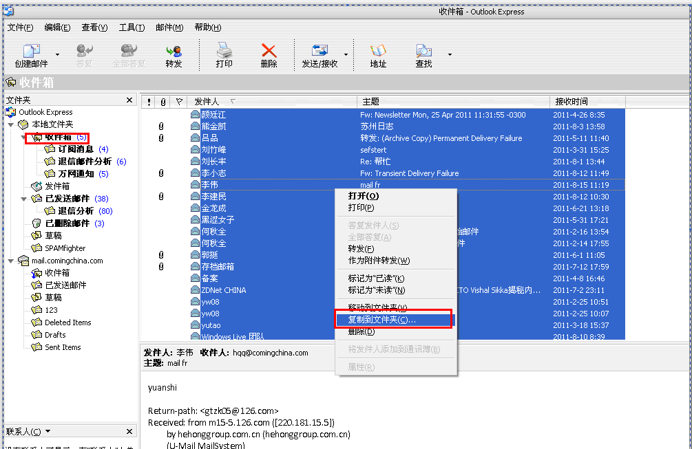 1.打開outlook express收信箱,并選中需要上傳的郵件.點(diǎn)擊鼠標(biāo)右鍵,點(diǎn)擊”復(fù)制到文件夾按鈕.”