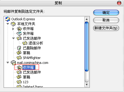 2.如上圖,點(diǎn)擊"復(fù)制到文件夾"按鈕以后,出現(xiàn)下面的如圖所示,選中IMAP帳號(hào)對(duì)應(yīng)的收件箱.