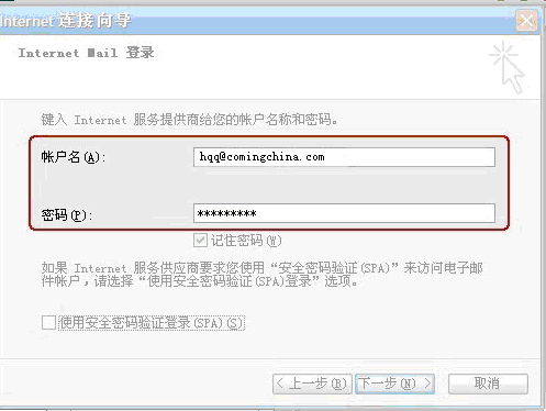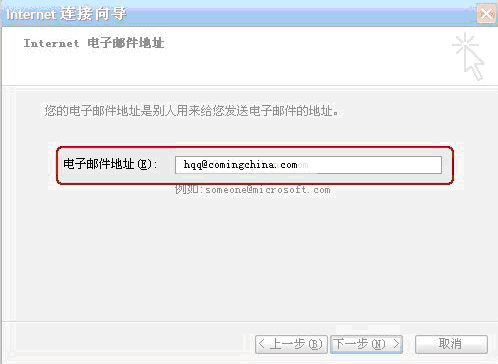 (4)、輸入您公司的電子郵件地址,如: hqq@comingchina.com,然后點(diǎn)擊“下一步”;
