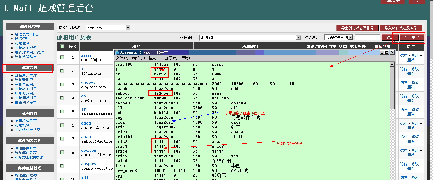 登陸管理員后臺---郵箱用戶管理---導出用戶-- 查看是否有弱密碼用戶,通知修改密碼