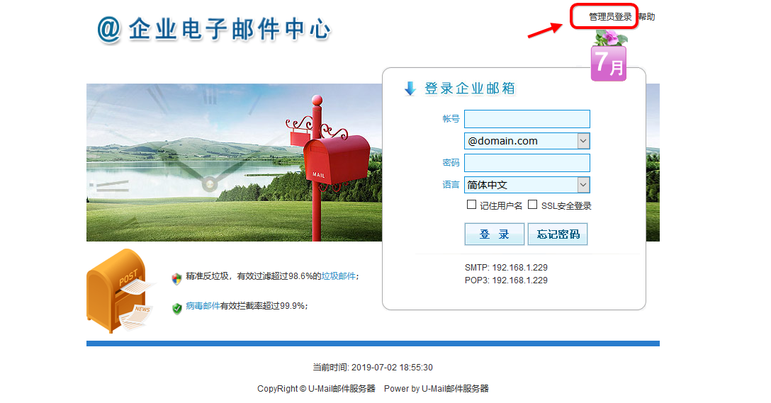 1、打開u-mail網頁登錄界面,點擊右上角“管理員登錄”
