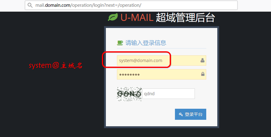 2、如果首頁沒有管理員登錄按鈕,輸入地址http://mail.domain.com/operation(具體地址改成您的域名和端口) 。登錄超域管理員(system@主域名 如 system@domain.com)