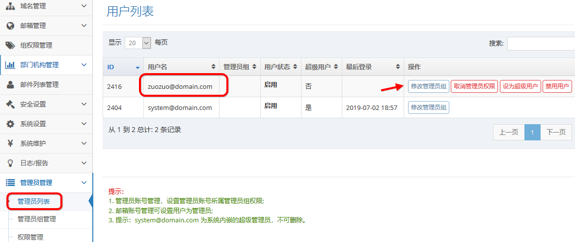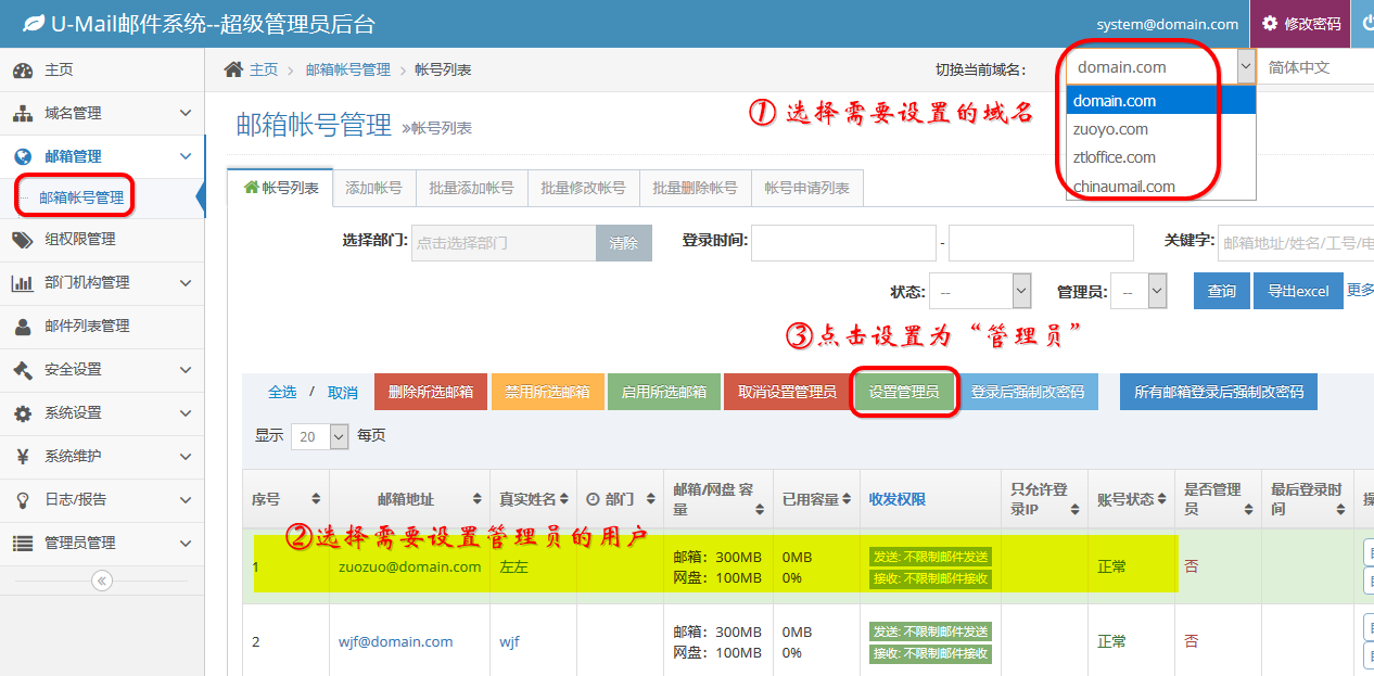 首先需要找到需要設置部門管理員的用戶,注意右上角可以切換域名。選中用戶,點擊“設置為管理員”