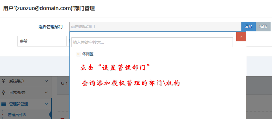 點擊“管理部門”選擇需要授權管理的部門,支持多個部門。勾選上級部門會自動關聯下級