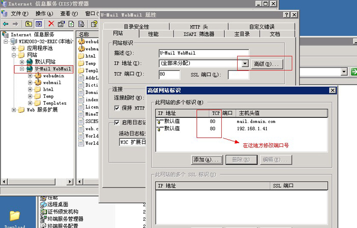 1. 登陸到服務器上在開始—設置—控制面板—管理工具—雙擊(Internet 信息服務(IIS)管理器),然后找到U-Mail WebMail--屬性--高級-然后把里面默認的80端口改成你所需要的端口號即可。如圖: