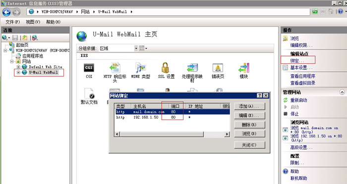 1. 登陸到服務器上在開始—設置—控制面板—管理工具—雙擊(Internet 信息服務(IIS)管理器)然后選到U-Mail WebMail,在右邊點擊綁定把里面默認的80修改成你所需要的端口號即可。如圖:
