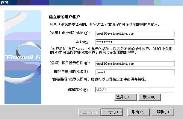 二、進入 Foxmail 向導,輸入“電子郵件地址”、“密碼”、“帳戶名稱”、“郵箱中采用的名稱”以及路徑選擇 ,點擊“下一步”;