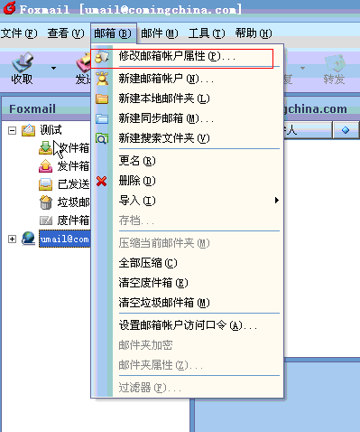 五、點擊“郵箱”菜單中的“修改郵箱帳戶屬性”;