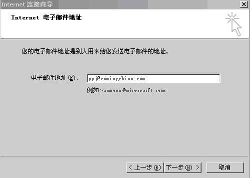 4.在電子郵件窗口中輸入您的電子郵件地址(如pyj@comingchina.com