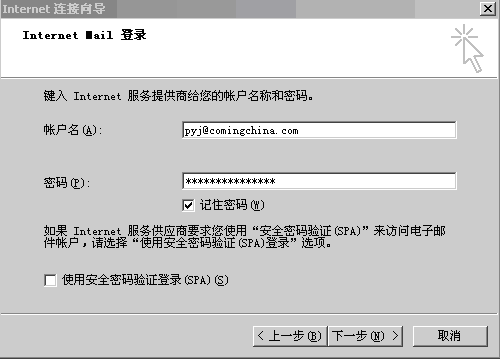 6.在帳戶名對(duì)話框中輸入您的帳戶名pyj@comingchina.com