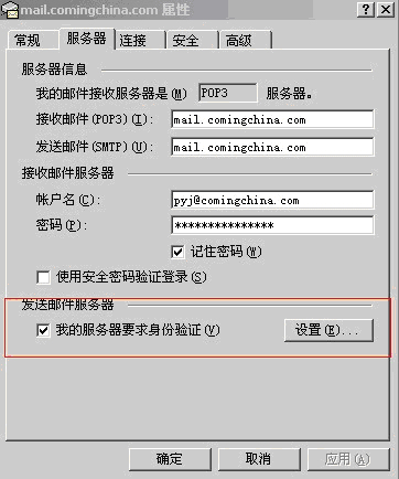 5. 在“POP3服務(wù)器”和“SMTP服務(wù)器”處填入"mail.你的域名"(例如您的域名是comingchina.com,就填寫(xiě)mail.comingchina.com),在“POP3賬戶名”處填入您的整個(gè)郵箱地址(如pyj@comingchina.com