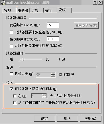 9.如需在郵箱中保留備份,點(diǎn)擊“高級(jí)”,勾選“在服務(wù)器上保留郵件的副本”:
