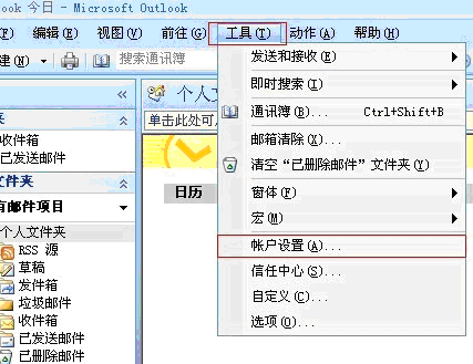 1. 在Microsoft OutLook2007中選擇“工具”菜單里的“帳號設置”選項: