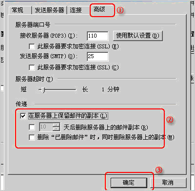 8. 如需在郵箱中保留備份,點擊“高級”,勾選“在服務器上保留郵件的副本”