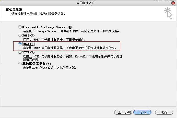 三、在彈出的對話框中,選擇您要設置的服務器類型,設置IMAP賬戶