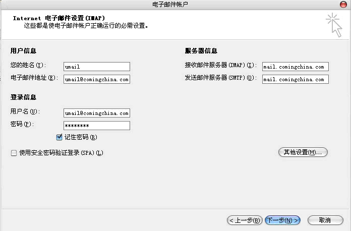 四、輸入您公司的電子郵件賬戶信息,根據(jù)您的實際情況填寫服務器地址和用戶賬戶和密碼